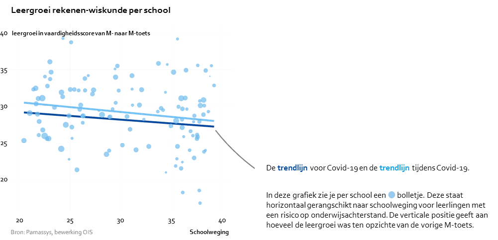 Niet iedere school heeft een inhaalslag gemaakt. Een deel van de scholen heeft hun leerlingen gemiddeld meer zien groeien dan voor Covid-19, maar er zijn ook scholen die minder uit hun leerlingen hebben weten te halen dan hiervoor. Scholen met een vergelijkbare populatie laten soms totaal verschillende resultaten zien. Gemiddeld genomen laten scholen met een lage schoolweging, wat het aandeel kinderen met een risico op onderwijsachterstand weergeeft, net wat meer leergroei zien dan scholen met een hoge schoolweging. Dit was voor Covid-19 ook al het geval.