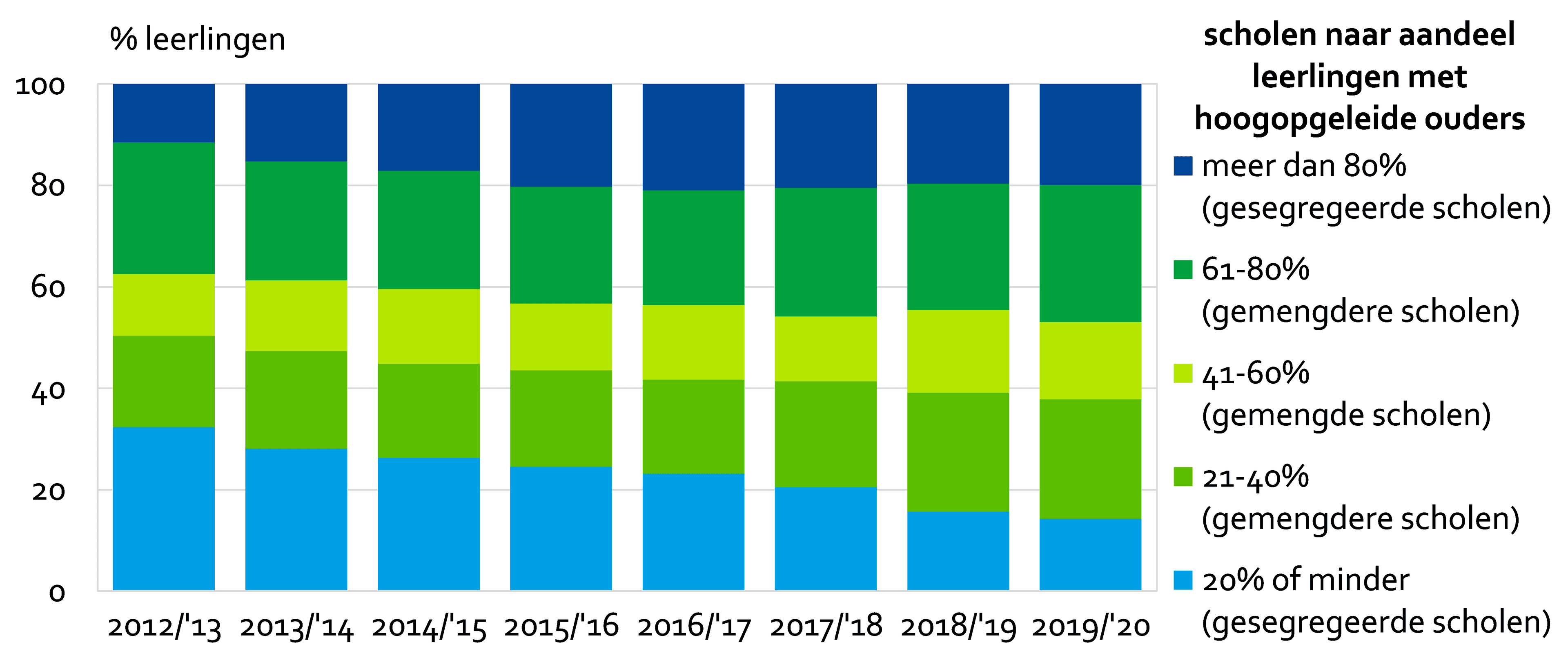 Ten opzichte van zeven jaar geleden is het aandeel basisschoolleerlingen op sterk gesegregeerde scholen gedaald van 44 procent in schooljaar 2012/’13 naar 34 procent in schooljaar 2019/’20. Amsterdamse ouders zijn steeds hoger opgeleid. Het aandeel leerlingen dat naar scholen met weinig kinderen met hoogopgeleide ouders gaat is flink afgenomen (met 18 procent). Het aandeel leerlingen op scholen met veel kinderen met hoogopgeleide ouders is in diezelfde periode toegenomen (met procentpunt), maar de afgelopen jaren is dit aandeel stabiel. De samenstelling van basisscholen hangt samen met de grootte van de school. Kleine scholen hebben relatief vaak een leerlingenpopulatie met maar heel weinig kinderen van hoogopgeleide ouders.