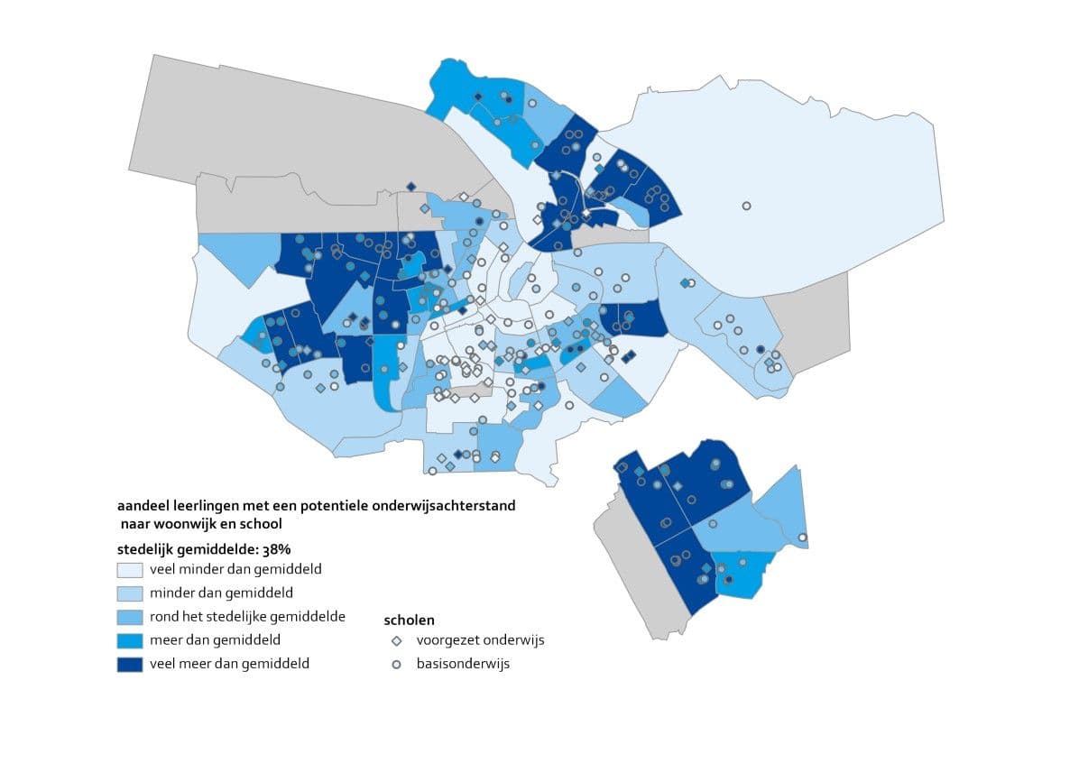 Het aandeel leerlingen met een potentiële onderwijsachterstand ligt net als in voorgaande jaren het hoogst in stadsdeel Zuidoost. Na Zuidoost wonen de meeste potentiële onderwijsachterstandsleerlingen in Nieuw-West en Noord. In Zuid en Centrum ligt het aandeel potentiële onderwijsachterstandsleerlingen het laagst. Er bestaan grote verschillen tussen scholen in het aandeel potentiële onderwijsachterstandsleerlingen en in de mate waarin zij daarmee een afspiegeling vormen van de wijk waarin zij staan. Zo gaan er bijvoorbeeld in Middenmeer in Oost, Slotervaart-Noord in Nieuw-West en de Helmersbuurt in West relatief meer potentiële onderwijsachterstandsleerlingen naar de scholen die daar staan dan dat er in de buurtcombinatie wonen. Waarschijnlijk gaan veel kinderen die hier wonen en geen potentiële onderwijsachterstand hebben naar scholen in andere delen van de stad.