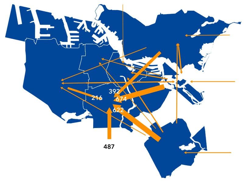 Leerlingen die in schooljaar 2019/'20 meer dan acht kilometer van school wonen naar stadsdeel. Bron: OIS