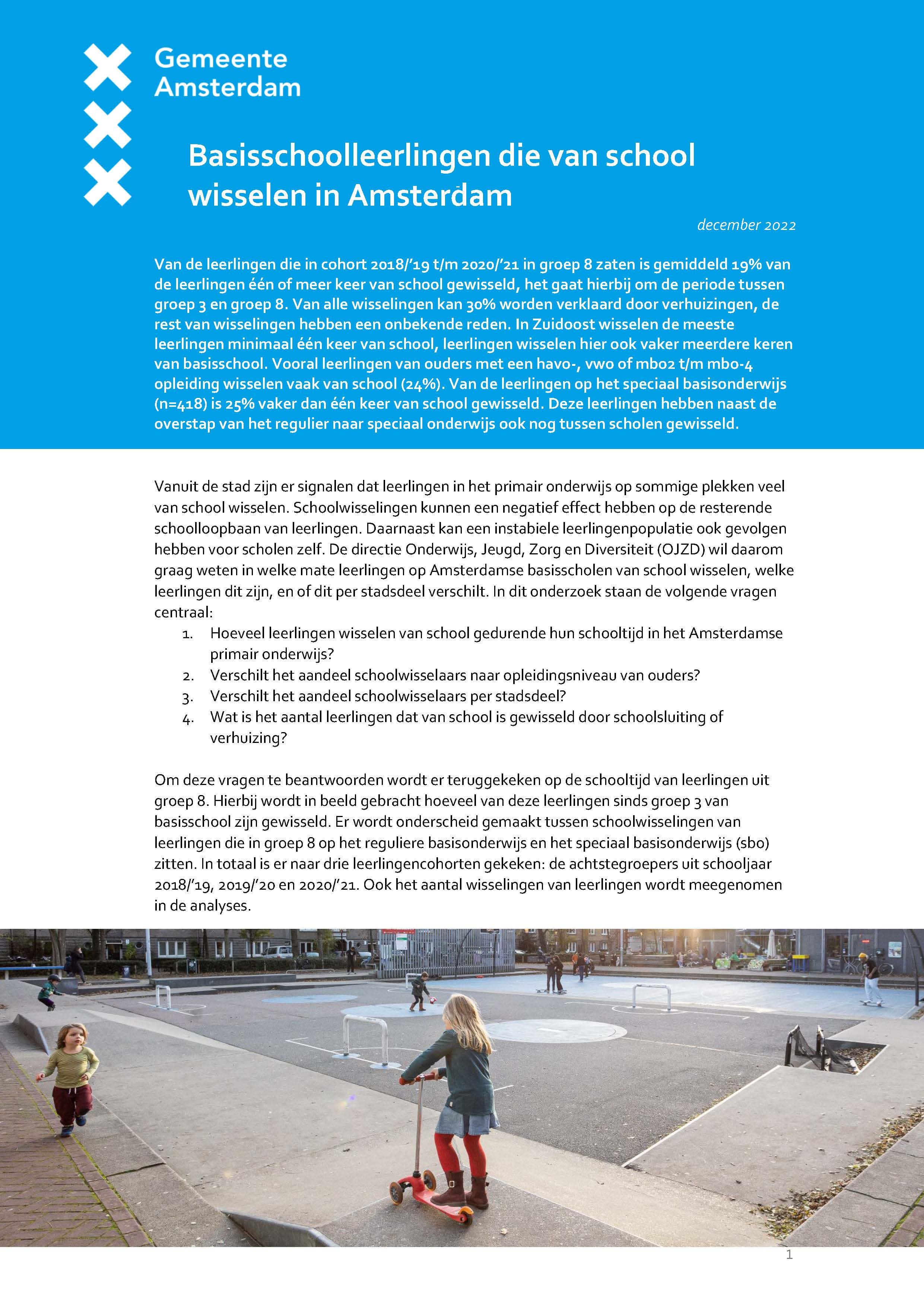 Schoolwisselingen kunnen een negatief effect hebben op de resterende schoolloopbaan van leerlingen. Daarnaast kan een instabiele leerlingenpopulatie ook gevolgen hebben voor scholen zelf. De afdeling Onderwijs van de gemeente Amsterdam wil daarom graag weten in welke mate leerlingen op Amsterdamse basisscholen van school wisselen, welke leerlingen dit zijn, en of dit per stadsdeel verschilt. Om deze vragen te beantwoorden wordt er teruggekeken op de schooltijd van leerlingen uit groep 8. Hierbij wordt in beeld gebracht hoeveel van deze leerlingen sinds groep 3 van basisschool zijn gewisseld.