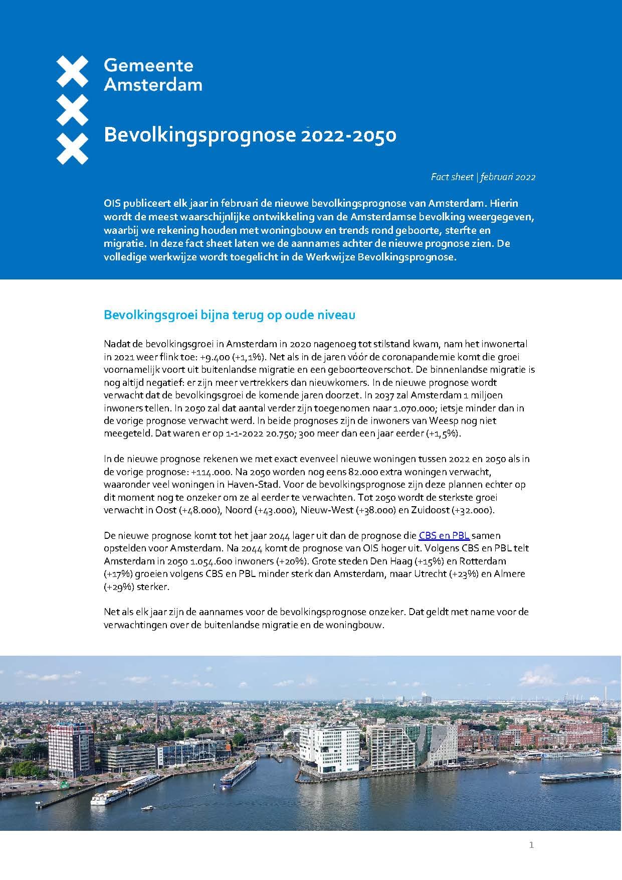 In de nieuwe prognose wordt verwacht dat de bevolkingsgroei de komende jaren doorzet. In 2037 zal Amsterdam 1 miljoen inwoners tellen. In 2050 zal dat aantal verder zijn toegenomen naar 1.070.000; ietsje minder dan in de vorige prognose verwacht werd. In beide prognoses zijn de inwoners van Weesp nog niet meegeteld. Dat waren er op 1-1-2022 20.750; 300 meer dan een jaar eerder (+1,5 procent).