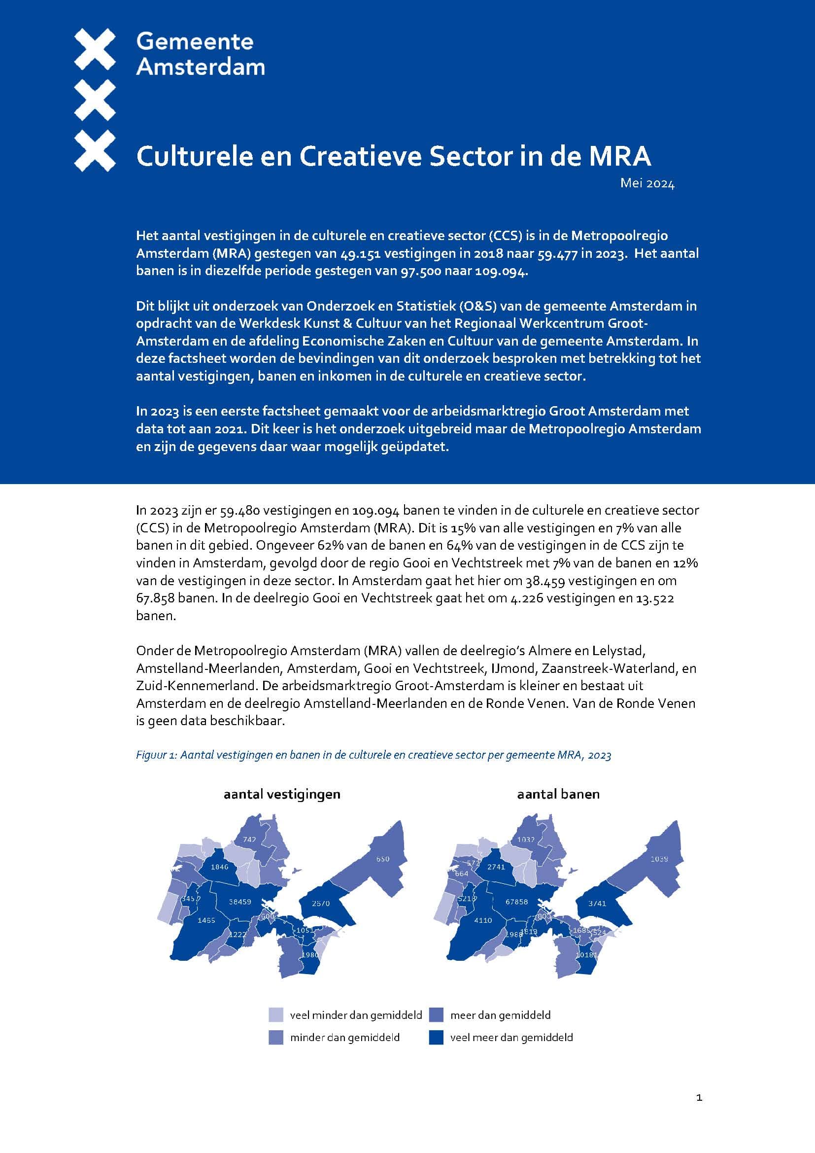 In 2023 zijn er ruim 59 duizend vestigingen in de culturele en creatieve sector in de Metropoolregio Amsterdam en 109 duizend banen. Dit blijkt uit onderzoek van O&S in opdracht van de Werkdesk Kunst & Cultuur van het Regionaal Werkcentrum Groot-Amsterdam en de afdeling Economische Zaken en Cultuur van de gemeente Amsterdam. Zowel het aantal vestigingen als het aantal banen is sinds 2018 gestegen.