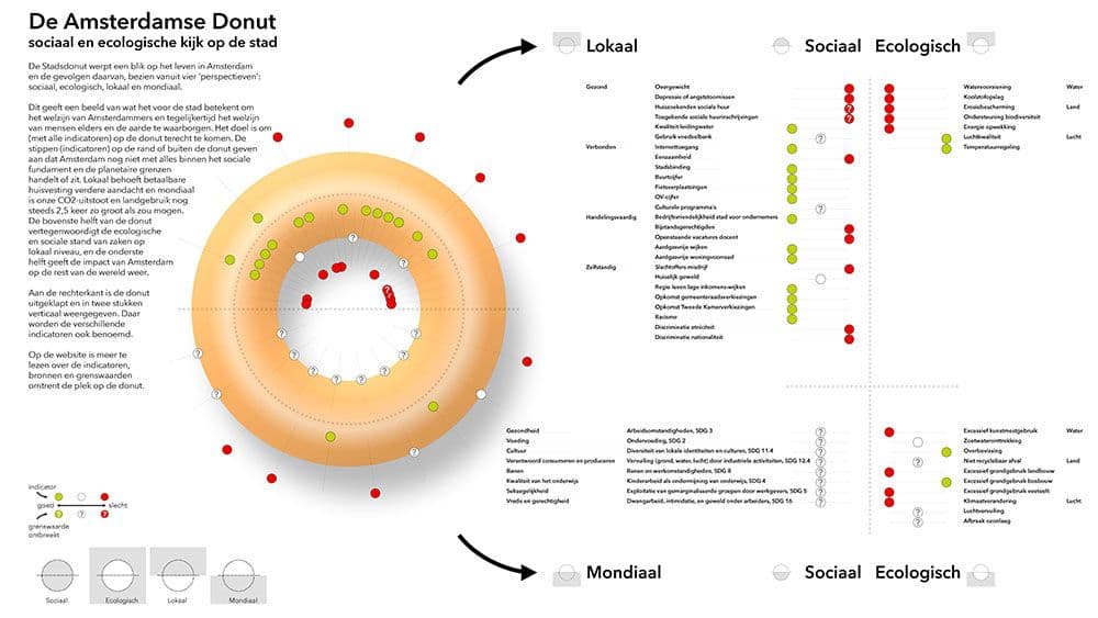 De stippen (indicatoren) op de rand of buiten de donut geven aan dat Amsterdam nog niet met alles binnen het sociale fundament en de planetaire grenzen handelt of zit. Lokaal behoeft betaalbare huisvesting verdere aandacht en mondiaal is onze CO2-uitstoot en landgebruik nog steeds 2,5 keer zo groot als zou mogen. De bovenste helft van de donut vertegenwoordigt de ecologische en sociale stand van zaken op lokaal niveau, en de onderste helft geeft de impact van Amsterdam op de rest van de wereld weer.