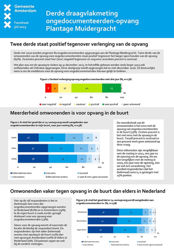Sinds mei 2020 worden ongeveer 80 ongedocumenteerden opgevangen aan de Plantage Muidergracht. Twee derde van de omwonenden van de opvang voor ongedocumenteerden staat positief tegenover het langer open houden van de opvang (65 procent). Zeventien procent staat hier (zeer) negatief tegenover en nog eens zeventien procent is neutraal.