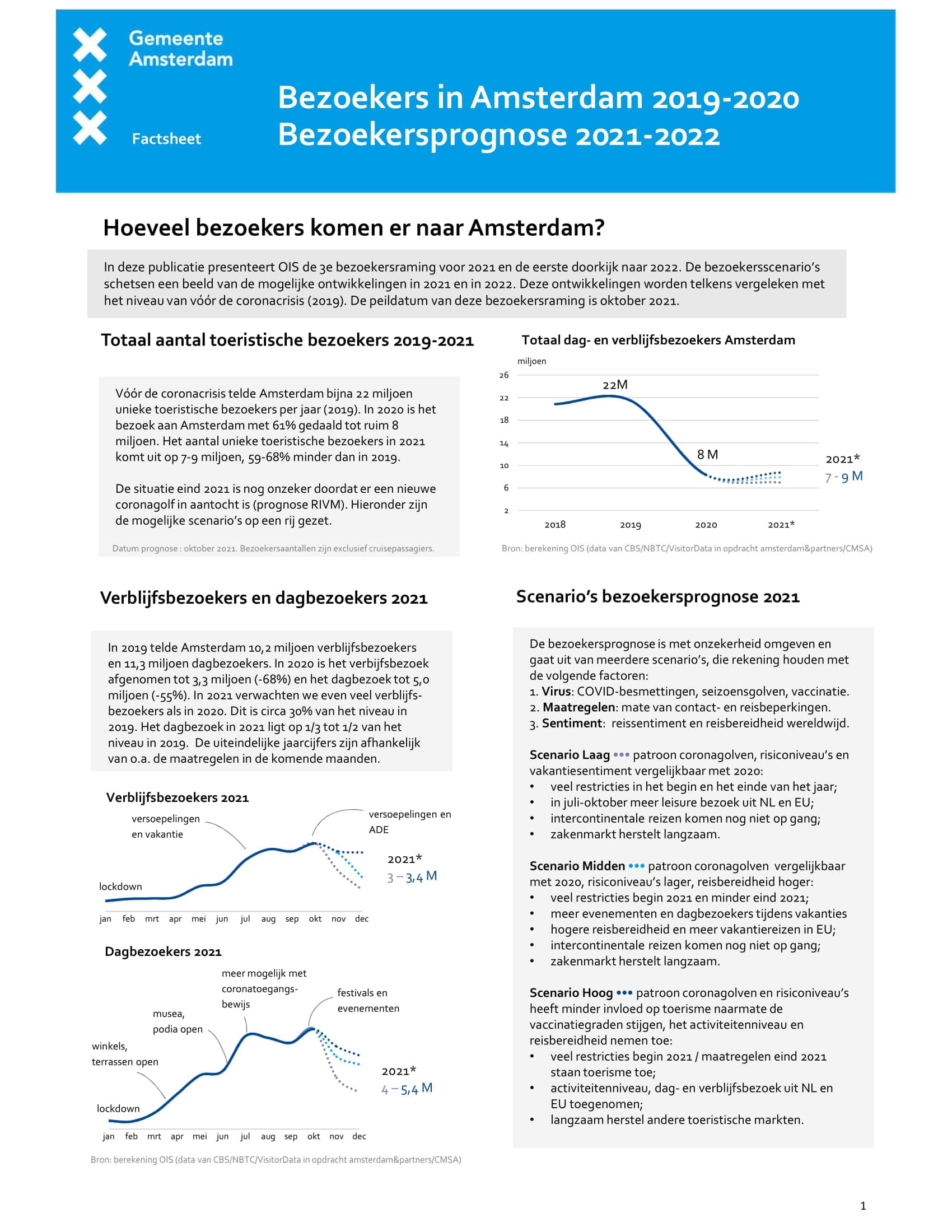 Vóór de coronacrisis telde Amsterdam bijna 22 miljoen unieke toeristische bezoekers per jaar (2019). In 2020 is het bezoek aan Amsterdam met 61 procent gedaald tot ruim 8 miljoen. Het aantal unieke toeristische bezoekers in 2021 komt uit op 7-9 miljoen, 59-68 procent minder dan in 2019. De situatie eind 2021 is nog onzeker door de coronagolf met nieuwe beperkende maatregelen. De eerste verwachtingen voor 2022 geven de mate van het herstel van het toerisme in Amsterdam weer. Het totaal aantal unieke toeristische bezoekers zal naar verwachting rond 60-80 procent van het niveau in 2019 uitkomen. Deze prognose wordt in 2022 geactualiseerd.