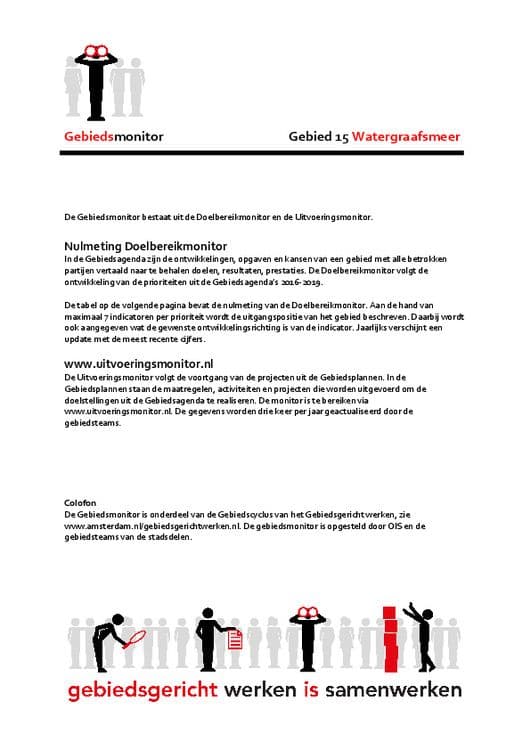 De Gebiedsmonitor bestaat uit de Doelbereikmonitor en de Uitvoeringsmonitor. De Gebiedsmonitor is onderdeel van de Gebiedscyclus van het Gebiedsgericht werken. De gebiedsmonitor is opgesteld door OIS en de gebiedsteams van de stadsdelen. Dit is de Doelbereikmonitor Watergraafsmeer 2016.