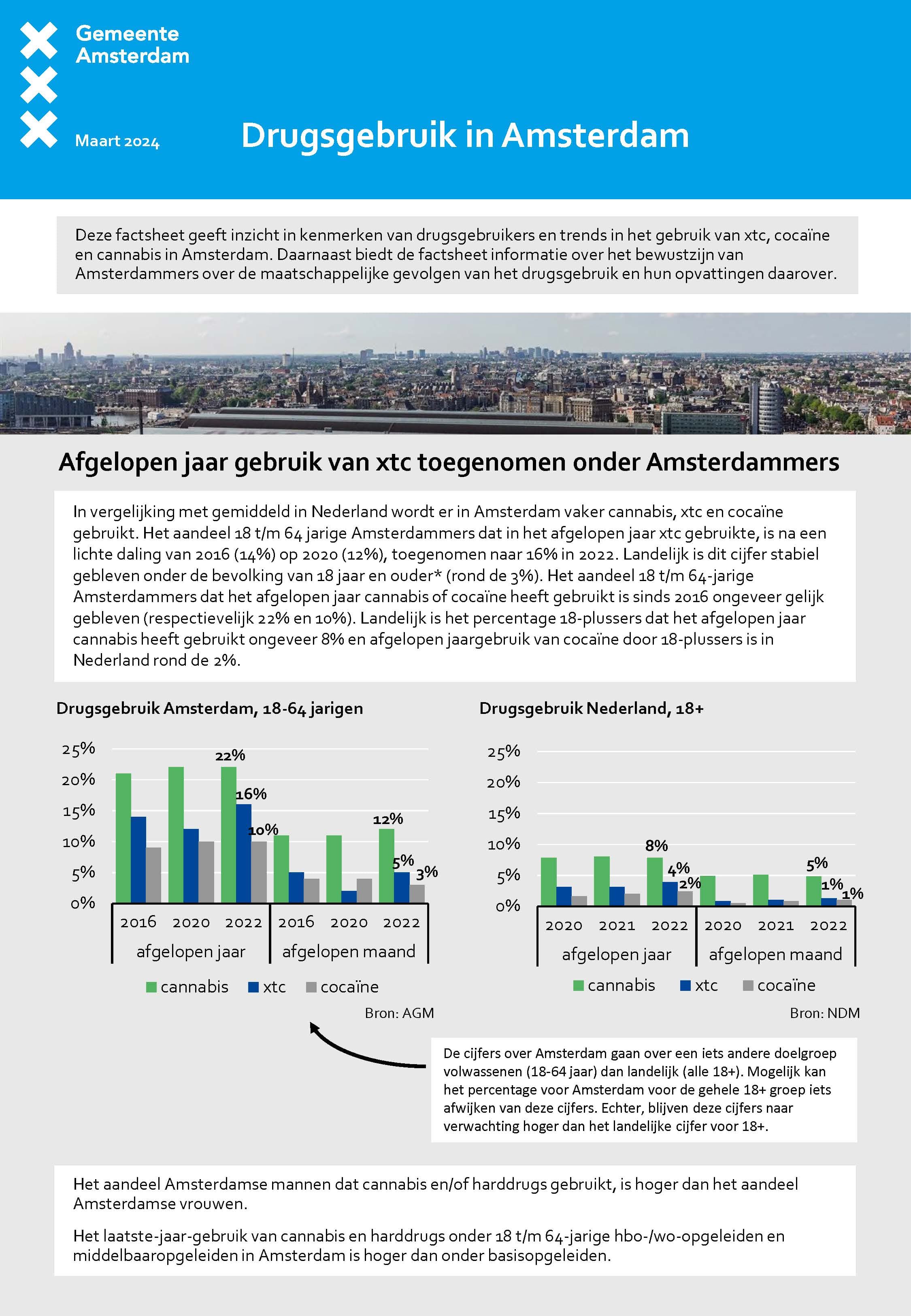 Het aandeel 18- tot 64-jarige Amsterdammers dat aangaf het laatste jaar xtc te hebben gebruikt, steeg van 12 procent in 2020 naar 16 procent in 2022. Lachgasgebruik daalde daarentegen van 5 naar 2 procent tussen 2020 en 2022. Het gebruik van cannabis en cocaïne bleef in deze periode stabiel. Ongeveer 22 procent van de volwassen Amsterdammers gebruikte in 2022 cannabis en 10 procent gebruikte cocaïne. Deze cijfers van de GGD over drugsgebruik onder Amsterdamse volwassenen liggen hoger dan de landelijke cijfers. Ook jongvolwassen Amsterdammers gebruiken meer xtc, cocaïne en cannabis dan de landelijke gemiddelden.