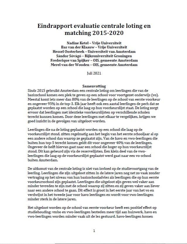 Eindrapport evaluatie centrale loting en matching voor middelbare scholen 2015-2020