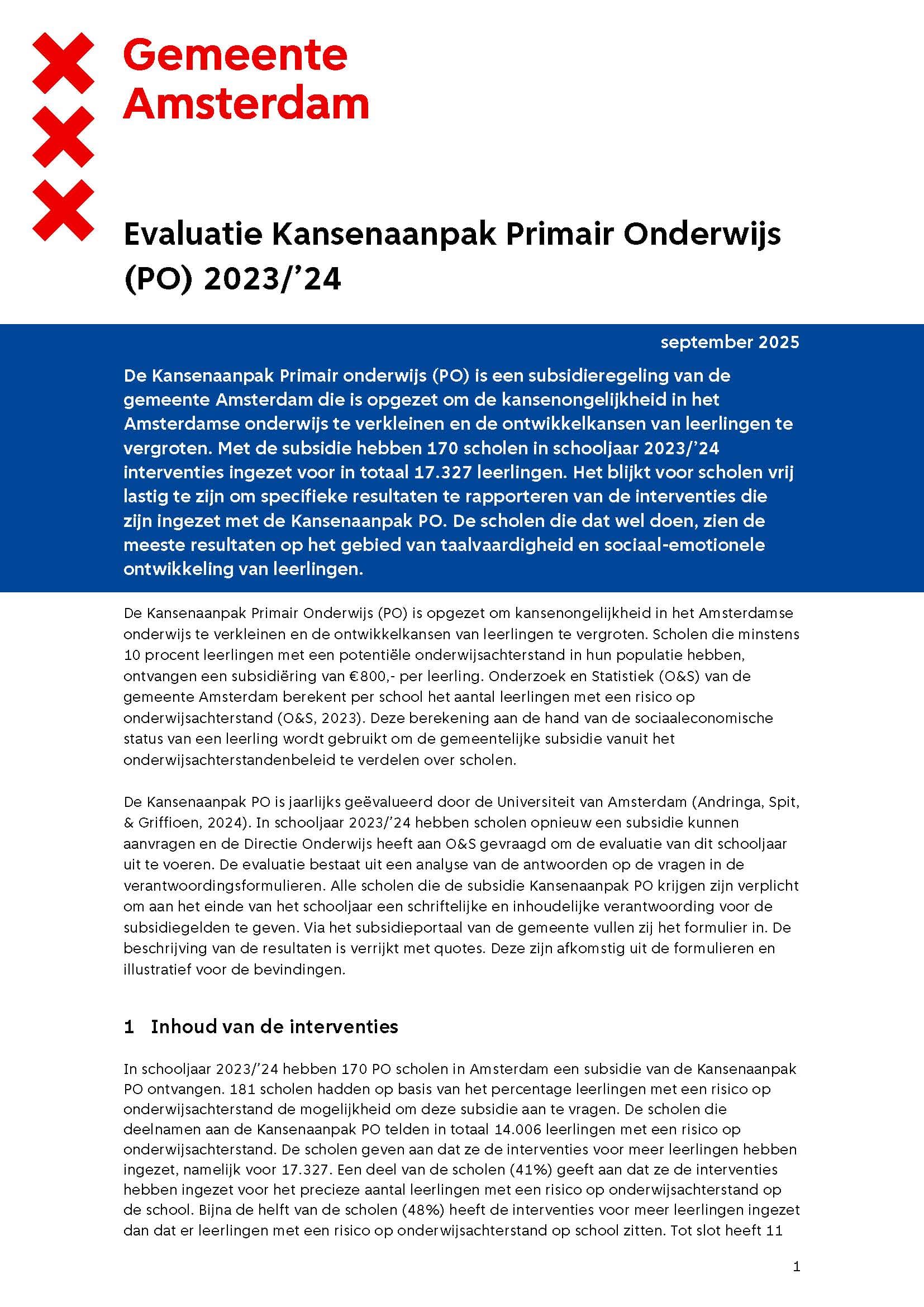 De Kansenaanpak Primair onderwijs (PO) is een subsidieregeling van de gemeente Amsterdam die is opgezet om de kansenongelijkheid in het Amsterdamse primair onderwijs te verkleinen en de ontwikkelkansen van leerlingen te vergroten. Scholen vullen een verantwoordingsformulier in over de inzet van de subsidie. Onderzoek en Statistiek heeft de formulieren geëvalueerd.