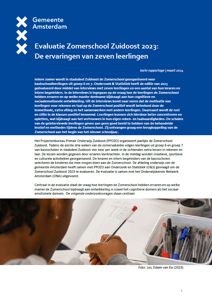 Iedere zomer wordt in stadsdeel Zuidoost de Zomerschool georganiseerd voor basisschoolleerlingen uit groep 6 en 7. Onderzoek en Statistiek heeft de editie van 2023 geëvalueerd door middel van interviews met zeven leerlingen en een aantal van hun leraren en intern begeleiders. In de interviews is ingegaan op de vraag hoe de leerlingen de Zomerschool hebben ervaren en op welke manier deelname bijdraagt aan hun cognitieve en sociaalemotionele ontwikkeling.