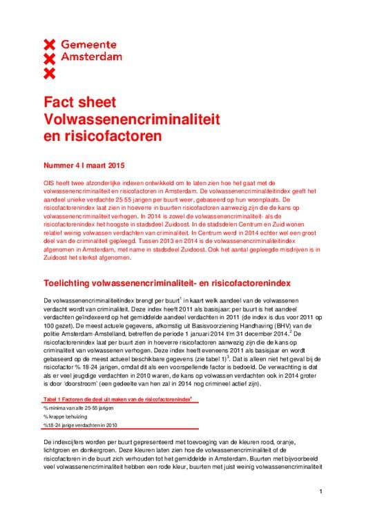 In 2014 is zowel de volwassenencriminaliteit- als de risicofactorenindex het hoogste in stadsdeel Zuidoost. In de stadsdelen Centrum en Zuid wonen relatief weinig volwassen verdachten van criminaliteit. In Centrum werd in 2014 echter wel een groot deel van de criminaliteit gepleegd. Tussen 2013 en 2014 is de volwassenencriminaliteitindex afgenomen in Amsterdam, met name in stadsdeel Zuidoost. Ook het aantal gepleegde misdrijven is in Zuidoost het sterkst afgenomen.