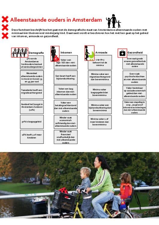 In 2017 telde Amsterdam ruim 25.500 eenoudergezinnen met tenminste één thuiswonend minderjarig kind. De meeste alleenstaande ouders wonen in de stadsdelen Zuidoost, Noord en Nieuw-West. Een groot deel van hen heeft een bijstandsuitkering als belangrijkste inkomstenbron. Dat blijkt uit de factsheet Alleenstaande ouders in Amsterdam.