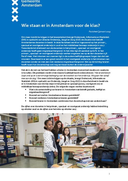 Om meer inzicht te krijgen in het lerarentekort brengt Onderzoek, Informatie en Statistiek (OIS) in opdracht van directie Onderwijs, Jeugd en Zorg (OJZ) de situatie wat betreft Amsterdamse docenten in beeld. In deze factsheet wordt er ingezoomd op het primair-, speciaal- en voortgezet onderwijs in 2016 en het middelbaar beroepsonderwijs in 2017.