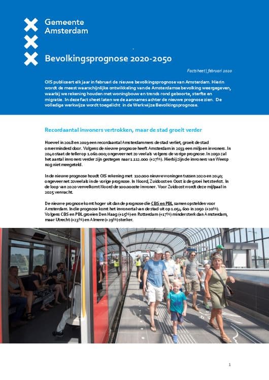 OIS publiceert elk jaar in februari de nieuwe bevolkingsprognose van Amsterdam. Hierin wordt de meest waarschijnlijke ontwikkeling van de Amsterdamse bevolking weergegeven, waarbij we rekening houden met woningbouw en trends rond geboorte, sterfte en migratie.