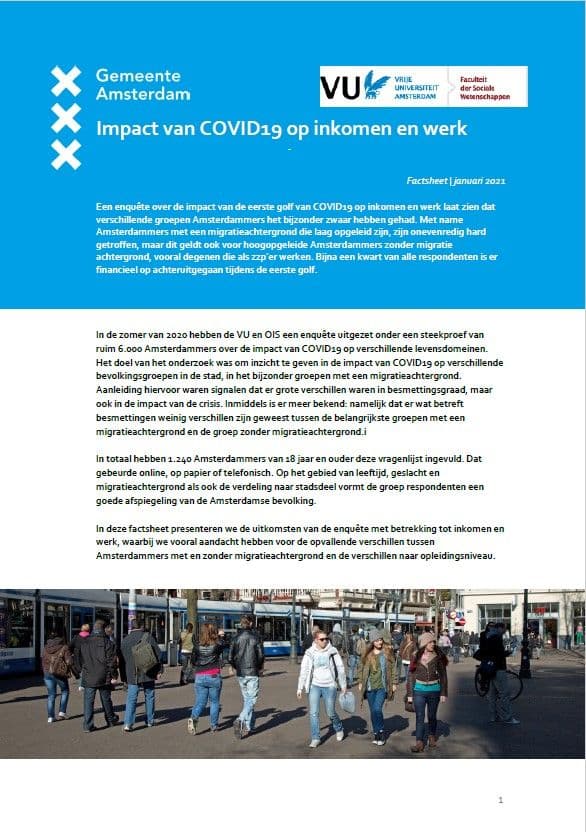 Een enquête over de impact van de eerste golf van COVID19 op inkomen en werk laat zien dat verschillende groepen Amsterdammers het bijzonder zwaar hebben gehad. Met name Amsterdammers met een migratieachtergrond die laag opgeleid zijn, zijn onevenredig hard getroffen, maar dit geldt ook voor hoogopgeleide Amsterdammers zonder migratie achtergrond, vooral degenen die als zzp’er werken. Bijna een kwart van alle respondenten is er financieel op achteruitgegaan tijdens de eerste golf.