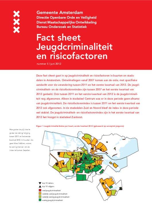 De jeugdcriminaliteit- en de risicofactorenindex zijn tussen 2007 en het eerste kwartaal van 2012 gedaald. Ook tussen 2011 en het eerste kwartaal van 2012 is de jeugdcriminaliteit nog afgenomen. Alleen in stadsdeel Centrum was er in deze periode geen afname van jeugdcriminaliteit. De risicofactorenindex is tussen 2011 en het eerste kwartaal van 2012 ook afgenomen. In de stadsdelen Zuid en Noord bleef de index in deze periode wel stabiel. De jeugdcriminaliteit- en risicofactorenindex zijn in het eerste kwartaal van 2012 het hoogst in stadsdeel Zuidoost.