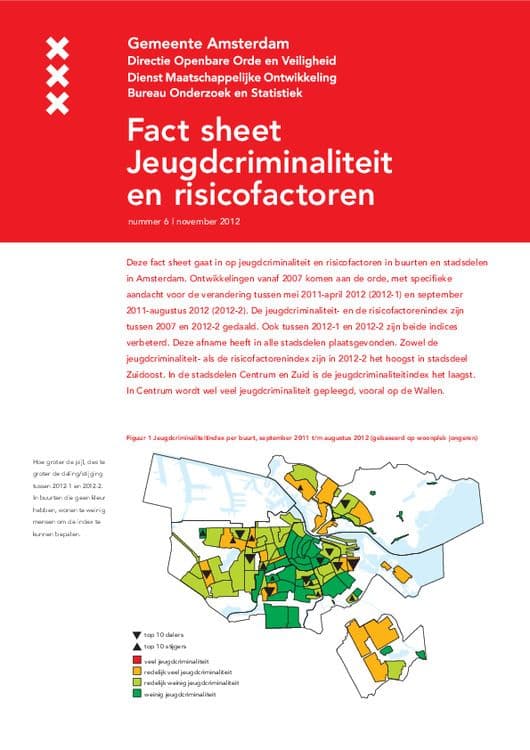 O+S heeft twee afzonderlijke indices ontwikkeld om elke vier maanden te laten zien hoe het gaat met de jeugdcriminaliteit en risicofactoren in Amsterdam. De jeugdcriminaliteit- en de risicofactorenindex zijn tussen 2007 en 2012-2 gedaald. Ook tussen 2012-1 en 2012-2 zijn beide indices verbeterd. Deze afname heeft in alle stadsdelen plaatsgevonden. Zowel de jeugdcriminaliteit- als de risicofactorenindex zijn in 2012-2 het hoogst in stadsdeel Zuidoost. In de stadsdelen Centrum en Zuid is de jeugdcriminaliteitindex het laagst. In Centrum wordt wel veel jeugdcriminaliteit gepleegd, vooral op de Wallen.