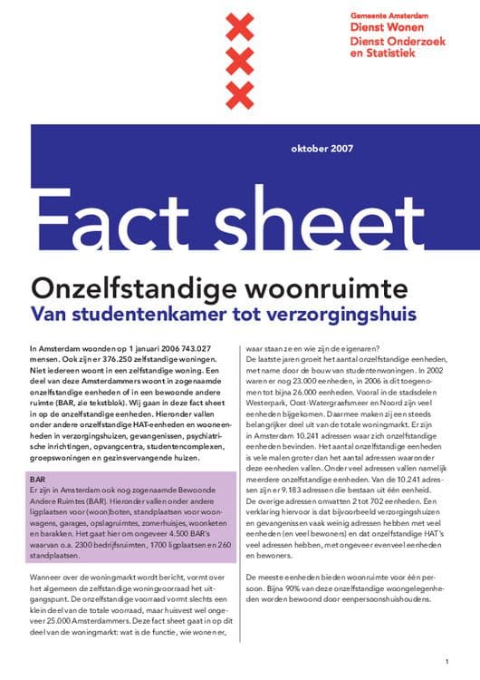 In Amsterdam woonden op 1 januari 2006 743.027 mensen. Ook zijn er 376.250 zelfstandige woningen. Niet iedereen woont in een zelfstandige woning. Een deel van deze Amsterdammers woont in zogenaamde onzelfstandige eenheden of in een bewoonde andere ruimte. In de factsheet 'Onzelfstandige woonruimte: van studentenkamer tot verzorgingshuis' gaan we in op de onzelfstandige eenheden. Hieronder vallen onder andere onzelfstandige HAT-eenheden en wooneenheden in verzorgingshuizen, gevangenissen, psychiatrische inrichtingen, opvangcentra, studentencomplexen, groepswoningen en gezinsvervangende huizen.