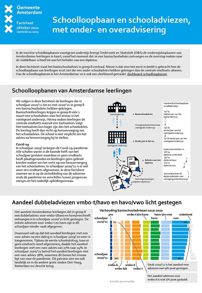 In de monitor schoolloopbanen voortgezet onderwijs brengt Onderzoek en Statistiek (O&S) de onderwijsloopbanen van Amsterdamse leerlingen in kaart, vanaf het moment dat ze een basisschooladvies ontvangen en de overstap maken naar de middelbare school tot aan het behalen van een diploma. In deze factsheet staat het basisschooladvies in groep 8 centraal. Nieuw is dat voor het eerst in beeld is gebracht hoe de schoolloopbaan van leerlingen eruit ziet die een ander schooladvies hebben gekregen dan de centrale eindtoets uitwees.