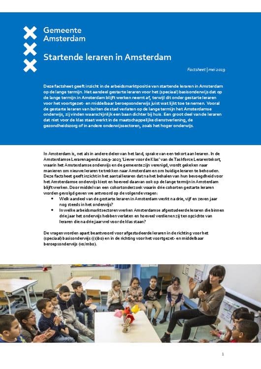 Deze factsheet geeft inzicht in de arbeidsmarktpositie van startende leraren in Amsterdam op de lange termijn. Het aandeel gestarte leraren voor het (speciaal) basisonderwijs dat op de lange termijn in Amsterdam blijft werken neemt af, terwijl dit onder gestarte leraren voor het voortgezet- en middelbaar beroepsonderwijs juist wat lijkt toe te nemen.