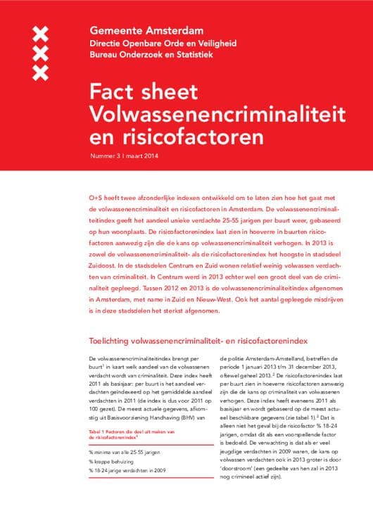O+S heeft twee afzonderlijke indexen ontwikkeld om te laten zien hoe het gaat met de volwassenencriminaliteit en risicofactoren in Amsterdam. De risicofactorenindex laat zien in hoeverre in buurten risicofactoren aanwezig zijn die de kans op volwassenencriminaliteit verhogen.