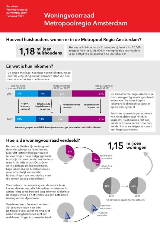 Het onderzoek Wonen in de Metropoolregio Amsterdam (WiMRA) vindt tweejaarlijks plaats en gaat in op verschillende aspecten van de woningmarkt in de MRA. De factsheet Woningvoorraad vat de resultaten samen uit het deelrapport Woningvooraad en Bewoning.
