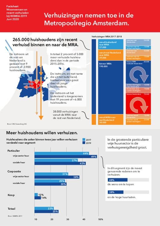 Het onderzoek Wonen in de Metropoolregio Amsterdam vindt tweejaarlijks plaats en gaat in op verschillende aspecten van de woningmarkt in de MRA. De factsheet Woonwensen en Recent Verhuisden vat de resultaten samen uit het gelijknamige deelrapport.