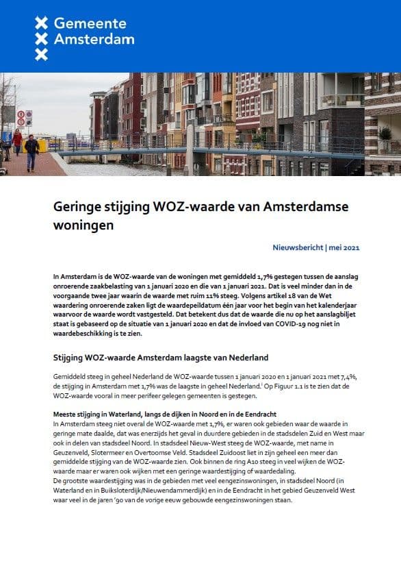 Gemiddeld steeg in geheel Nederland de WOZ-waarde tussen 1 januari 2020 en 1 januari 2021 met 7,4 procent, de stijging in Amsterdam met 1,7 procent was de laagste in geheel Nederland. De WOZ-waarde is vooral in meer perifeer gelegen gemeenten gestegen.