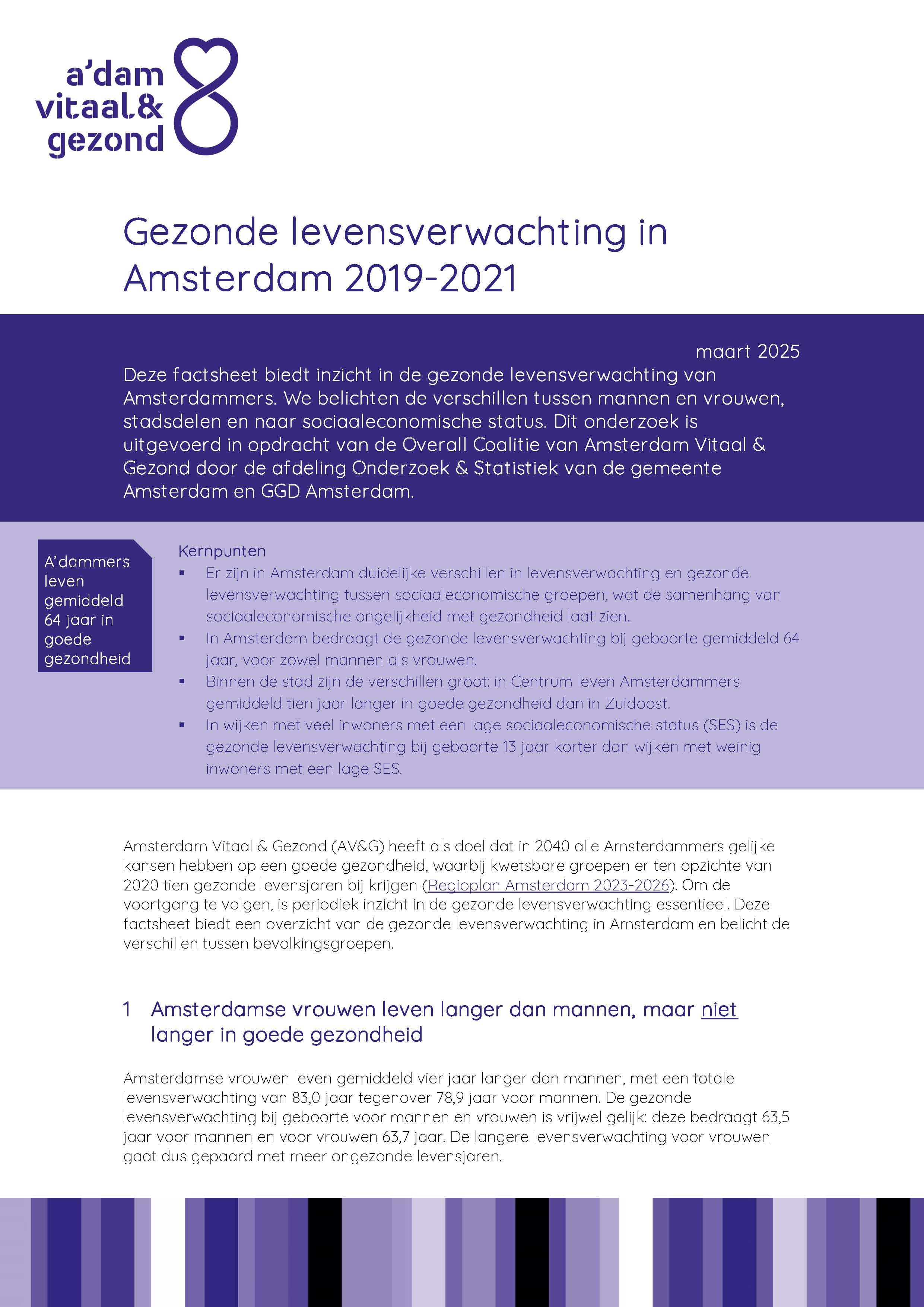 Amsterdam Vitaal & Gezond (AV&G) heeft als doel dat in 2040 alle Amsterdammers gelijke kansen hebben op een goede gezondheid, waarbij kwetsbare groepen er ten opzichte van 2020 tien gezonde levensjaren bij krijgen. In 2019-2021 was de gezonde levensverwachting bij geboorte gemiddeld 64 jaar voor zowel mannen als vrouwen. Vrouwen leven gemiddeld vier jaar langer dan mannen, maar brengen ook meer jaren in ongezondheid door.