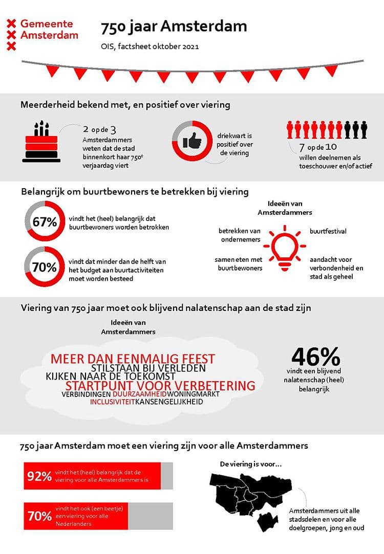 Voordat de viering van 750 jaar Amsterdam plaatsvindt, wil de gemeente Amsterdam graag weten in hoeverre Amsterdammers bekend zijn met het jubileum en hoe zij de viering willen invullen. OIS zal daarom tot en met het jubileumjaar (2025) hier onderzoek naar doen. OIS heeft bij deze meting groepsgesprekken gevoerd met Amsterdammers en een enquête onder bijna duizend Amsterdammers afgenomen.