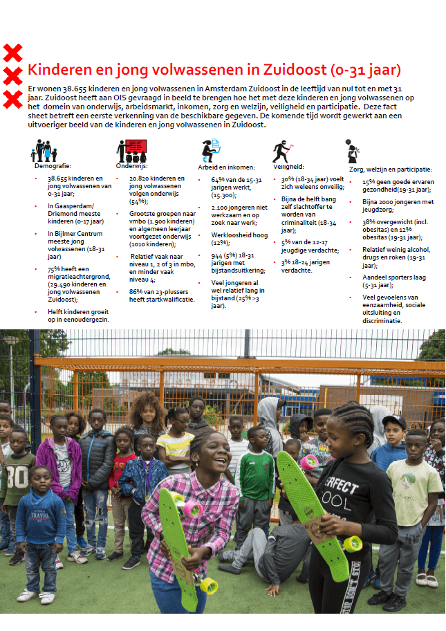 Er wonen 38.655 kinderen en jongvolwassenen in Amsterdam Zuidoost in de leeftijd van nul tot en met 31 jaar. Zuidoost heeft aan OIS gevraagd in beeld te brengen hoe het met deze kinderen en jongvolwassenen op het domein van onderwijs, arbeidsmarkt, inkomen, zorg en welzijn, veiligheid en participatie.