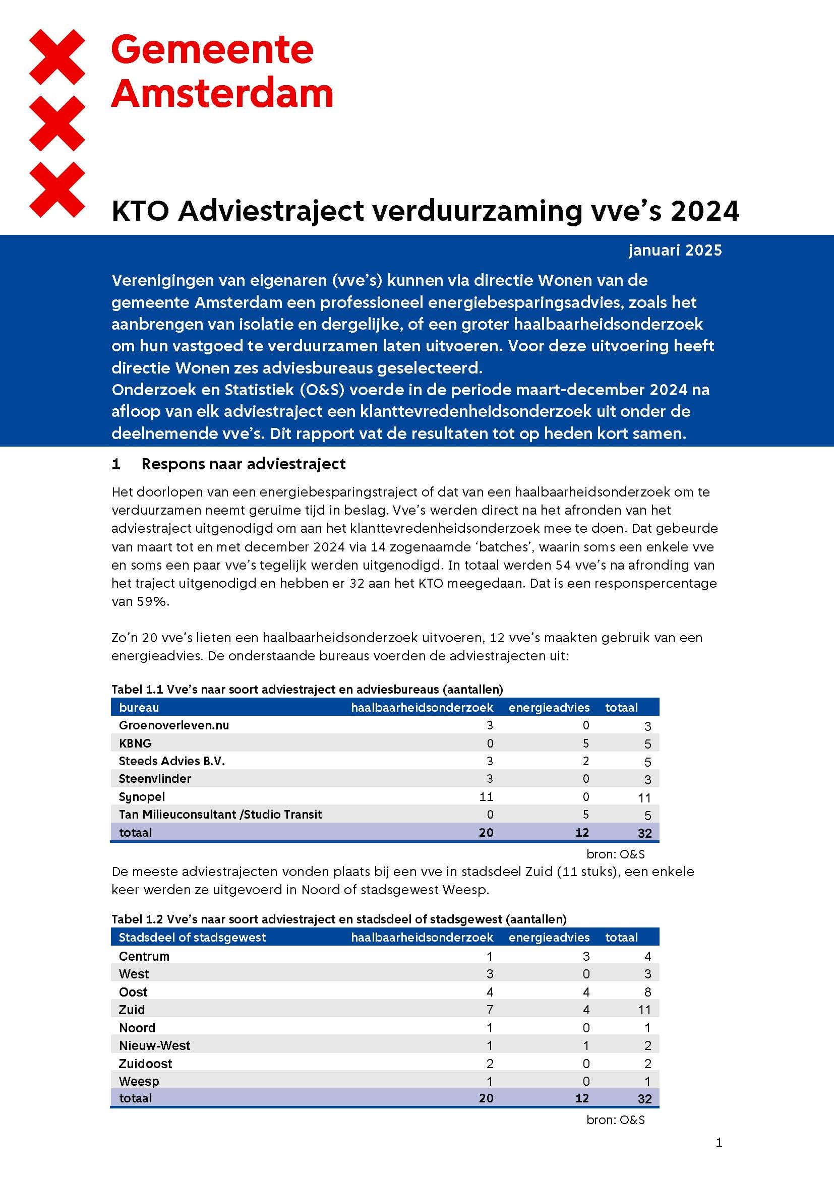 Verenigingen van eigenaren (vve’s) kunnen via directie Wonen van de gemeente Amsterdam een professioneel energiebesparingsadvies krijgen. Ook kunnen zij via deze weg een groter haalbaarheidsonderzoek om hun vastgoed te verduurzamen laten uitvoeren. De meerderheid van de vve’s is over het algemeen tevreden over deze adviezen en onderzoeken. Dat blijkt uit dit klanttevredenheidsonderzoek dat Onderzoek en Statistiek (O&S) uitvoerde.