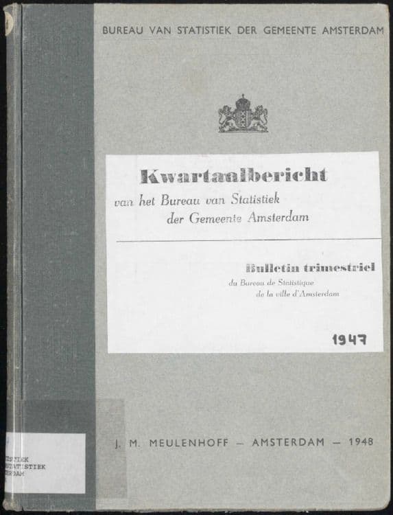 Dit is het statistisch jaarboek van de gemeente Amsterdam 1947 bestaande uit vier kwartaalberichten. In de kwartaalberichten staan onder andere cijfers over meteorologie, waterstanden, bevolking, ziekten, handel en verkeer, financiële zaken, overnachtingen, markten, waterleiding/ gas/ elektriciteit, openbare veiligheid, bibliotheken, museumbezoek, arbeidsbemiddeling, armoede, wonen, onderwijs en gemeentefinanciën.
