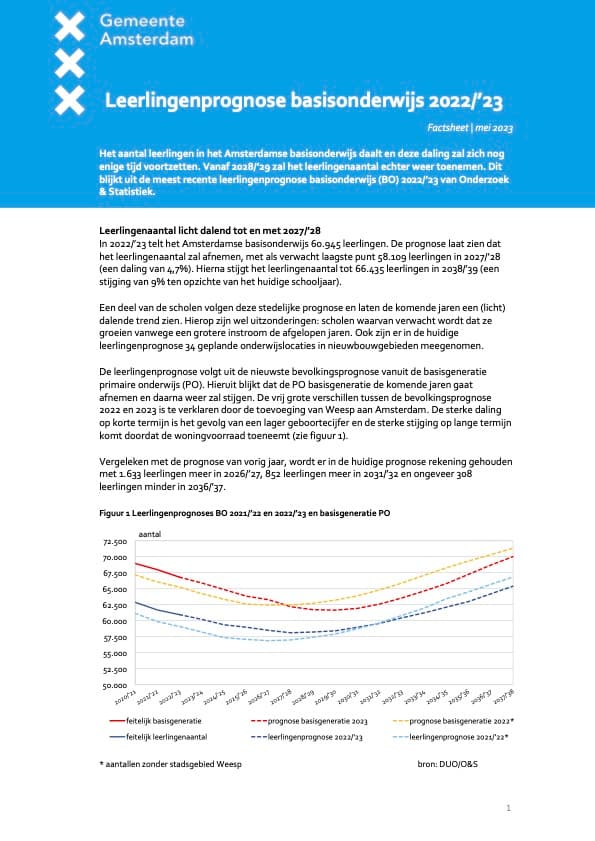In 2022/’23 telt het Amsterdamse basisonderwijs 60.945 leerlingen. De prognose laat zien dat het leerlingenaantal zal afnemen, met als verwacht laagste punt 58.109 leerlingen in 2027/’28 (een daling van 4,7 procent). Hierna stijgt het leerlingenaantal tot 66.435 leerlingen in 2038/’39 (een stijging van 9 procent ten opzichte van het huidige schooljaar).