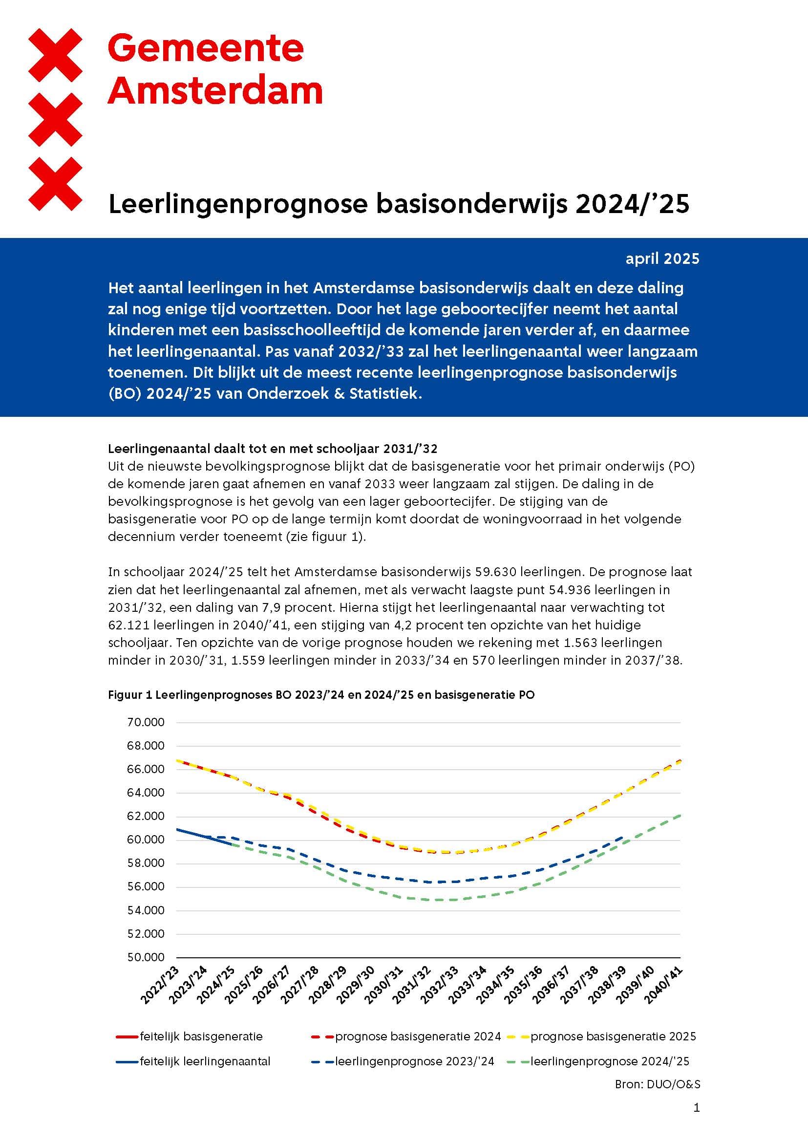 In schooljaar 2024/’25 telt het Amsterdamse basisonderwijs 59.630 leerlingen. De prognose laat zien dat het leerlingenaantal zal afnemen, met als verwacht laagste punt 54.936 leerlingen in 2031/’32. Hierna stijgt het leerlingenaantal naar verwachting tot 62.121 leerlingen in 2040/’41.