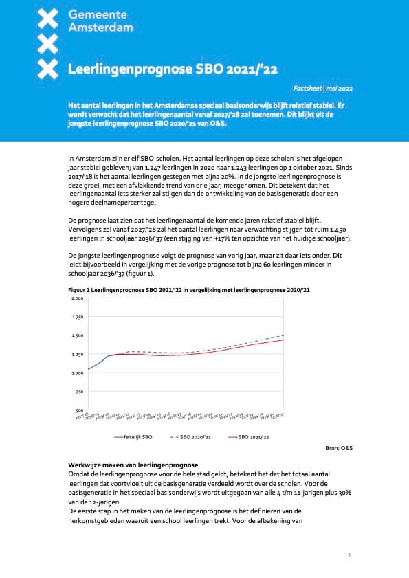 Het aantal leerlingen in het Amsterdamse speciaal basisonderwijs blijft relatief stabiel. Er wordt verwacht dat het leerlingenaantal vanaf 2027/’28 zal toenemen. Dit blijkt uit de jongste leerlingenprognose SBO 2020/’21 van O&S.