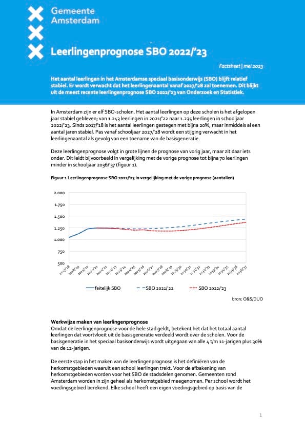 In Amsterdam zijn er elf SBO-scholen. Het aantal leerlingen op deze scholen is het afgelopen jaar stabiel gebleven; van 1.243 leerlingen in 2021/’22 naar 1.235 leerlingen in schooljaar 2022/’23. Sinds 2017/’18 is het aantal leerlingen gestegen met bijna 20 procent, maar inmiddels al een aantal jaren stabiel. Pas vanaf schooljaar 2027/’28 wordt een stijging verwacht in het leerlingenaantal als gevolg van een toename van de basisgeneratie.