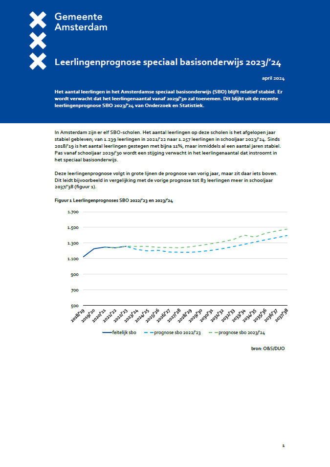 In Amsterdam zijn er 11 SBO-scholen. Het aantal leerlingen op deze scholen is het afgelopen jaar stabiel gebleven; van 1.239 leerlingen in 2021/’22 naar 1.257 leerlingen in schooljaar 2023/’24. Sinds 2018/’19 is het aantal leerlingen gestegen met bijna 11 procent, maar inmiddels al een aantal jaren stabiel. Pas vanaf schooljaar 2029/’30 wordt een stijging verwacht in het leerlingenaantal dat instroomt in het speciaal basisonderwijs.