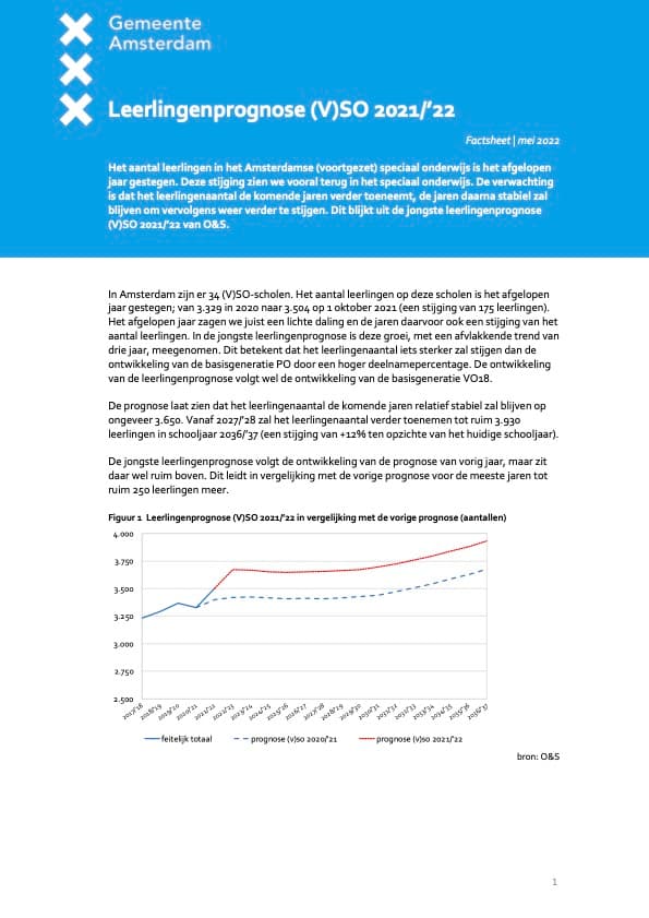 Het aantal leerlingen in het Amsterdamse (voortgezet) speciaal onderwijs is het afgelopen jaar gestegen. Deze stijging zien we vooral terug in het speciaal onderwijs. De verwachting is dat het leerlingenaantal de komende jaren verder toeneemt, de jaren daarna stabiel zal blijven om vervolgens weer verder te stijgen. Dit blijkt uit de jongste leerlingenprognose (V)SO 2021/’22 van O&S.