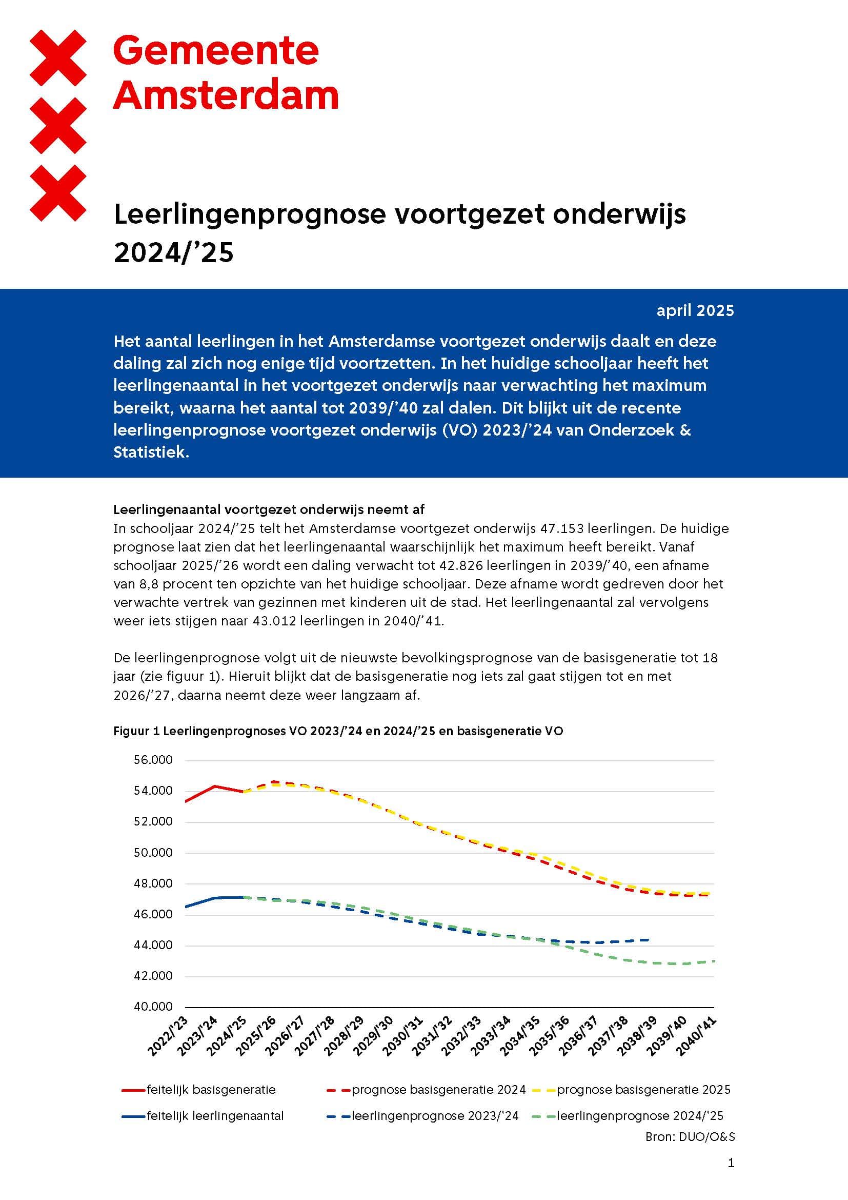 In schooljaar 2024/’25 telt het Amsterdamse voortgezet onderwijs 47.153 leerlingen. De huidige prognose laat zien dat het leerlingenaantal waarschijnlijk het maximum heeft bereikt. Vanaf schooljaar 2025/’26 wordt een daling verwacht tot 42.826 leerlingen in 2039/’40.