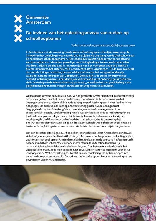 In groep 8 krijgen basisschoolleerlingen een advies voor het te volgen niveau op de middelbare school. Sinds 2015 is het advies van de basisschool hierin leidend, en niet meer de eindtoets. In deze masterscriptie is onderzocht of hoogopgeleide ouders sinds deze wijziging meer invloed hebben gekregen op de totstandkoming van het basisschooladvies. Daarnaast is ook gekeken naar de invloed van het opleidingsniveau van ouders op het niveau van Amsterdamse leerlingen in de eerste en derde klas van de middelbare school.