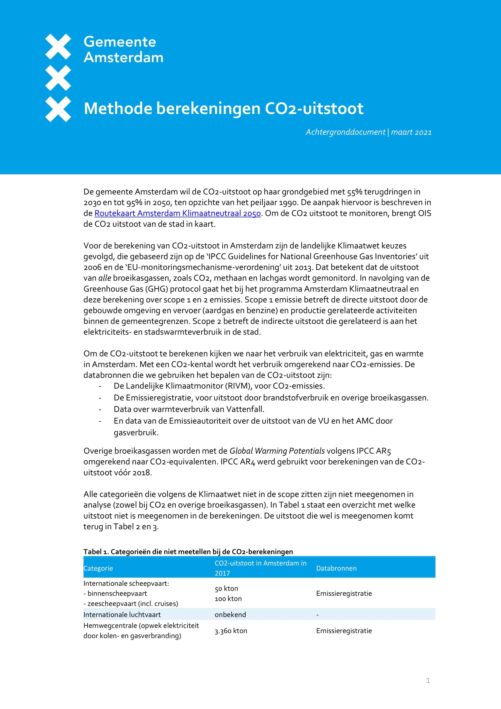 Voor de berekening van CO2-uitstoot in Amsterdam zijn de landelijke Klimaatwet keuzes gevolgd, die gebaseerd zijn op de ‘IPCC Guidelines for National Greenhouse Gas Inventories’ uit 2006 en de ‘EU-monitoringsmechanisme-verordening’ uit 2013. Dat betekent dat de uitstoot van alle broeikasgassen, zoals CO2, methaan en lachgas wordt gemonitord. In navolging van de Greenhouse Gas (GHG) protocol gaat het bij het programma Amsterdam Klimaatneutraal en deze berekening over scope 1 en 2 emissies. Scope 1 emissie betreft de directe uitstoot door de gebouwde omgeving en vervoer (aardgas en benzine) en productie gerelateerde activiteiten binnen de gemeentegrenzen. Scope 2 betreft de indirecte uitstoot die gerelateerd is aan het elektriciteits- en stadswarmteverbruik in de stad.