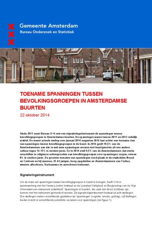 De spanningen waren tussen 2011 en 2013 redelijk stabiel. De meest actuele meting over januari - augustus 2014 laat echter een toename zien van spanningen tussen bevolkingsgroepen in de buurt. In 2014 geeft 19,5 procent van de Amsterdammers aan dat ze wel eens spanningen ervaren met buurtgenoten uit een andere cultuur tegen 14-15 procent in eerdere jaren. En in 2014 stelt 9,5 procent van de Amsterdammers dat sterke verschillen in religieuze achtergronden van bevolkingsgroepen voor spanningen zorgen, versus 8 procent in eerdere jaren. De grootste toename van spanningen vond plaats in de stadsdelen Noord en Centrum en bij mannen, 35-44 jarigen, hoog opgeleiden en Amsterdammers van Turkse, westers allochtone, Surinaamse en autochtone herkomst.