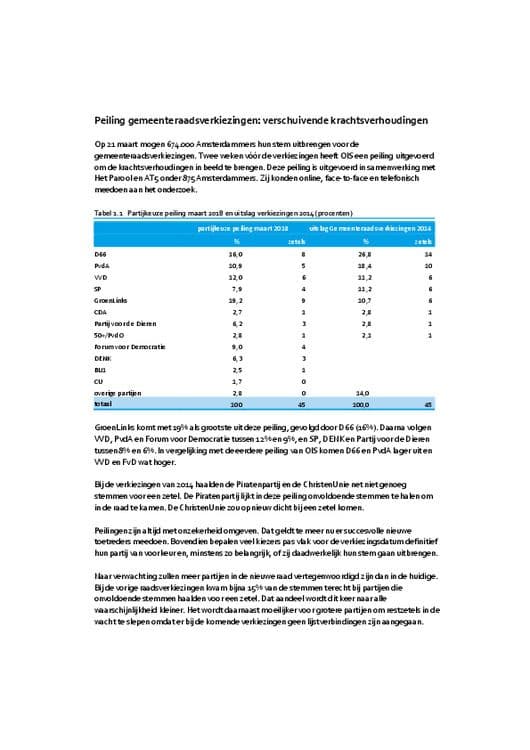 Op 21 maart mogen 674.000 Amsterdammers hun stem uitbrengen voor de gemeenteraadsverkiezingen. Twee weken vóór de verkiezingen heeft OIS een peiling uitgevoerd om de krachtsverhoudingen in beeld te brengen. Deze peiling is uitgevoerd in samenwerking met Het Parool en AT5 onder 875 Amsterdammers. Zij konden online, face‐to‐face en telefonisch meedoen aan het onderzoek.