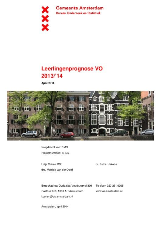 In opdracht van Dienst Maatschappelijke Ontwikkeling (DMO) heeft Bureau Onderzoek en Statistiek (O+S) de leerlingenprognose VO 2013/'14 uitgevoerd. De prognose wordt onder meer gebruikt voor de planningen van huisvesting van scholen.