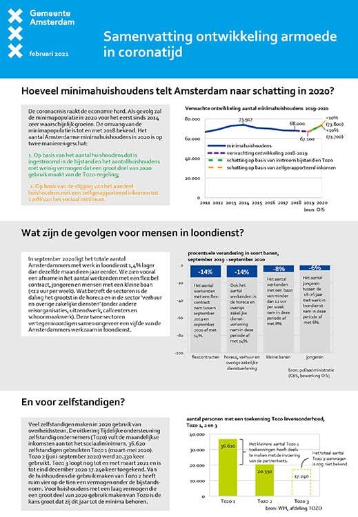 Hoeveel minimahuishoudens telt Amsterdam naar schatting in 2020? Wat zijn de gevolgen voor mensen in loondienst? En voor zelfstandigen? Welke ontwikkelingen zien we in de WW en de bijstand? Wat zijn de gevolgen van de coronacrisis voor de inkomens van Amsterdammers?