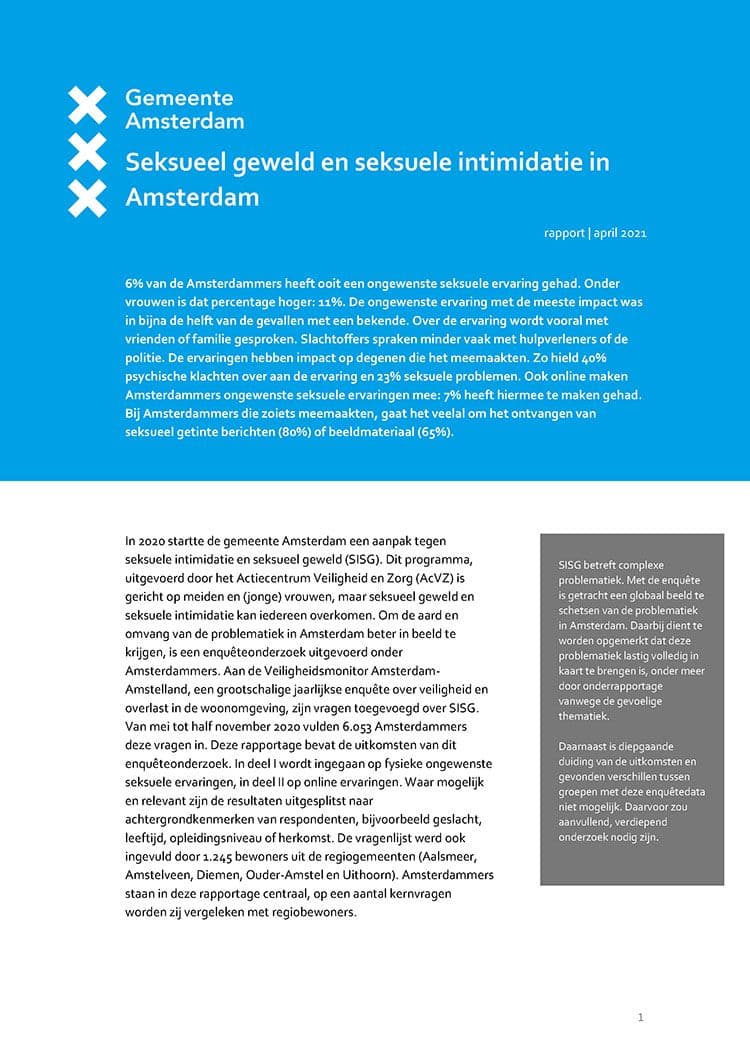 In 2020 startte de gemeente Amsterdam een aanpak tegen seksuele intimidatie en seksueel geweld (SISG). Dit programma, uitgevoerd door het Actiecentrum Veiligheid en Zorg (AcVZ) is gericht op meiden en (jonge) vrouwen, maar seksueel geweld en seksuele intimidatie kan iedereen overkomen. Om de aard en omvang van de problematiek in Amsterdam beter in beeld te krijgen, is een enquêteonderzoek uitgevoerd onder Amsterdammers. Aan de Veiligheidsmonitor Amsterdam-Amstelland, een grootschalige jaarlijkse enquête over veiligheid en overlast in de woonomgeving, zijn vragen toegevoegd over SISG. Van mei tot half november 2020 vulden 6.053 Amsterdammers deze vragen in. Deze rapportage bevat de uitkomsten van dit enquêteonderzoek. In deel I wordt ingegaan op fysieke ongewenste seksuele ervaringen, in deel II op online ervaringen.