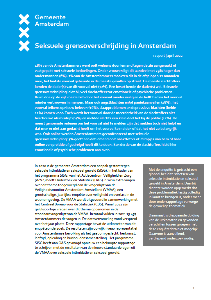 In 2020 is de gemeente Amsterdam een aanpak gestart tegen seksuele intimidatie en seksueel geweld (SISG). In het kader van het programma SISG, van het Actiecentrum Veiligheid en Zorg (AcVZ) heeft Onderzoek en Statistiek (O&S) in 2020 extra vragen over dit thema toegevoegd aan de vragenlijst van de Veiligheidsmonitor Amsterdam-Amstelland (VMAA). Vanaf 2021 zijn gelijksoortige vragen over dit thema opgenomen in de standaardvragenlijst van de VMAA. In totaal vulden in 2021 15.457 Amsterdammers de vragen in.