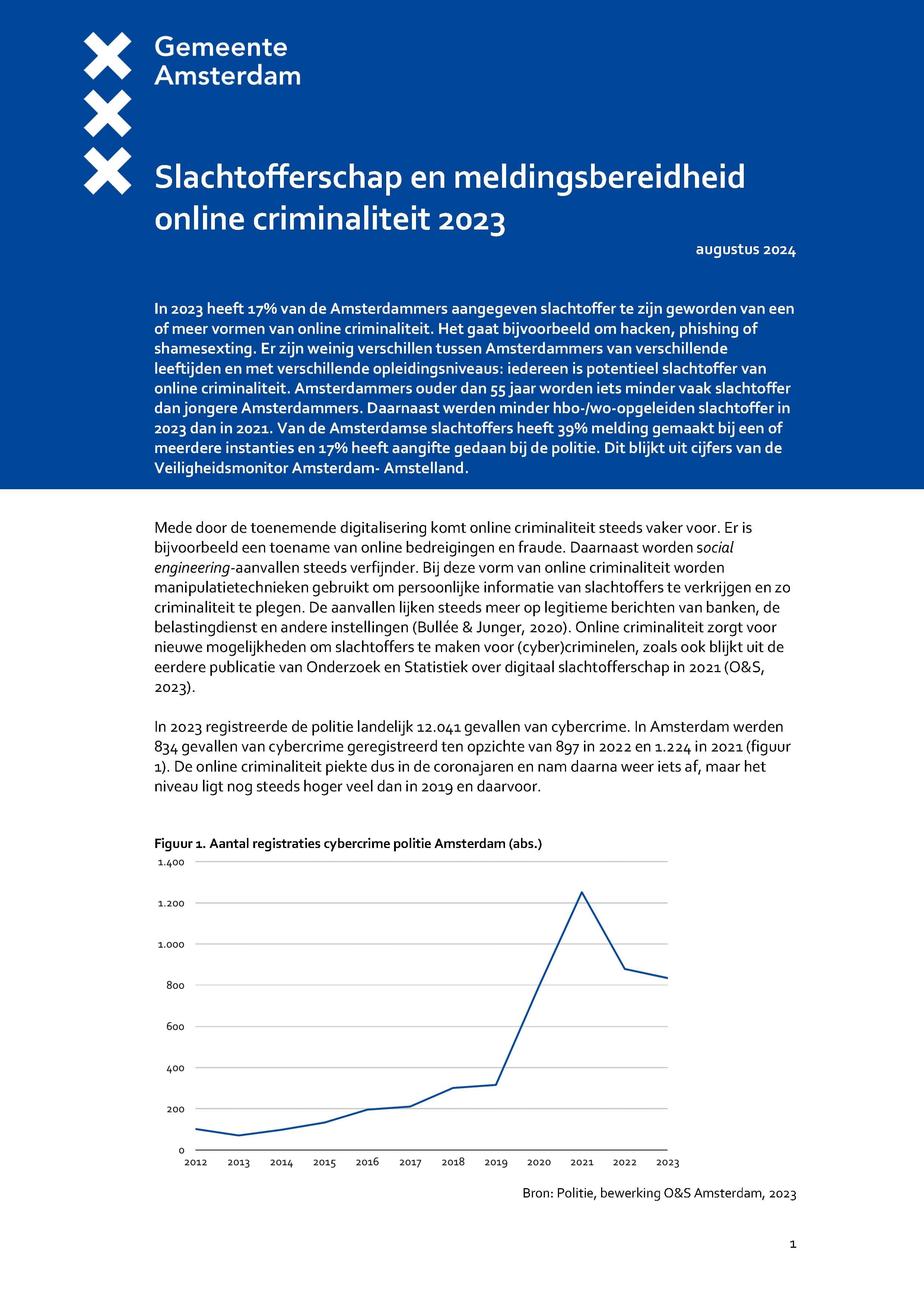 De afgelopen jaren is online criminaliteit toegenomen. Onder online criminaliteit vallen bijvoorbeeld delicten als hacken, phishing of shamesexting. In 2023 heeft 17 procent van de Amsterdammers aangegeven slachtoffer te zijn geworden van een of meer vormen van online criminaliteit.